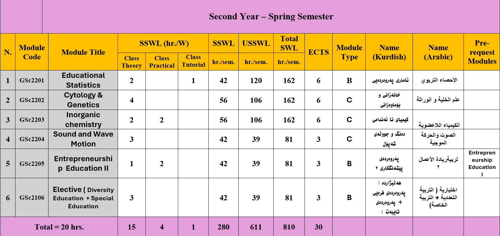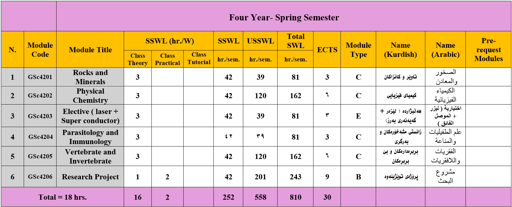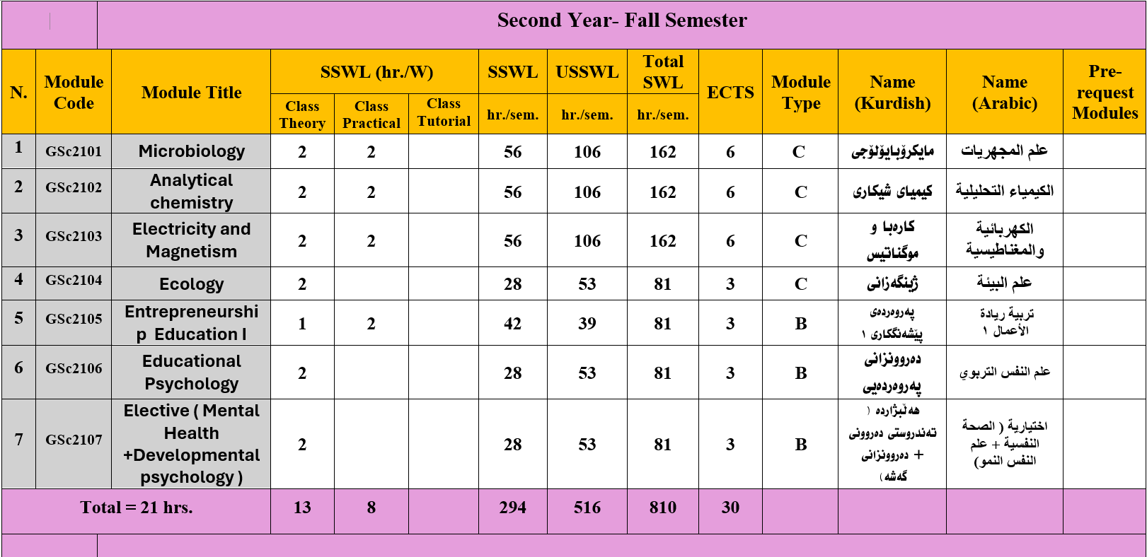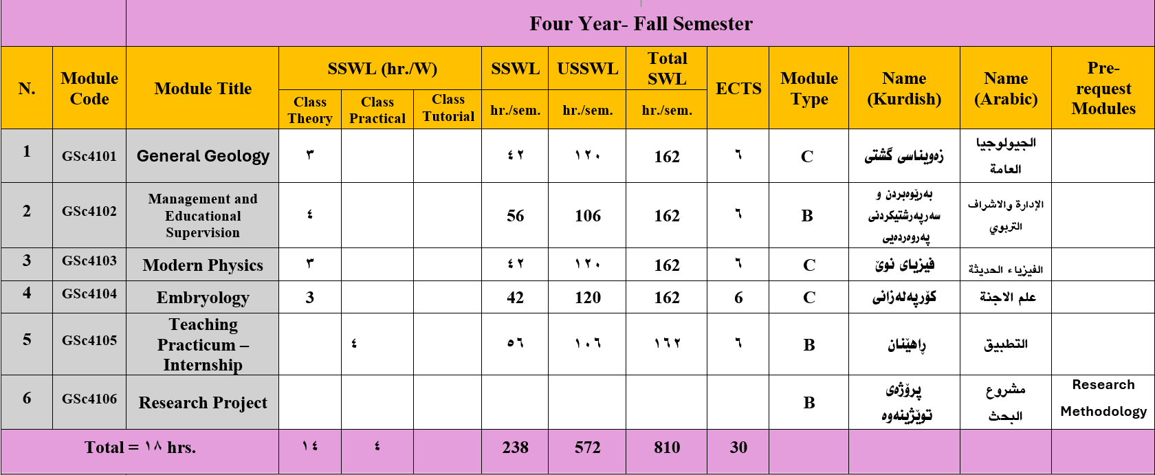 - Core courses: includes subjects such as (Biology, Chemistry, Physics, Geology, Ecology, Education psychology, measurement and Evaluation, Methods of Teaching Science and Environmental Science.