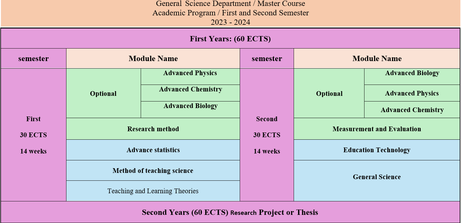 - First Course: (30 ECTS) advanced physics, advanced chemistry, advanced biology, advance statistics, methods of teaching science, teaching and learning theory, Research Methods in Education.
